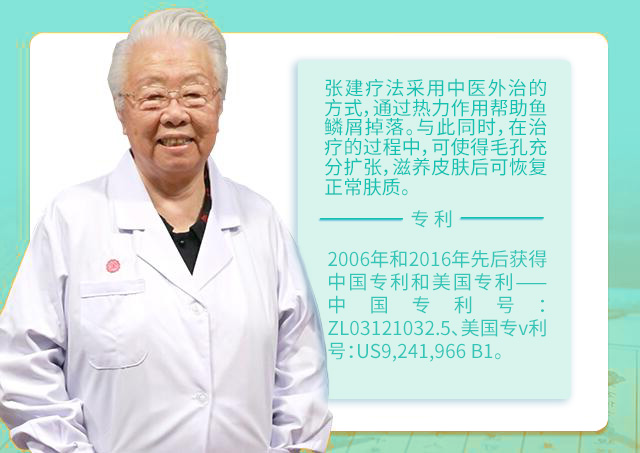 張建療法采用中醫(yī)外治的方式,通過熱力作用幫助魚鱗屑掉落。與此同時,在治療的過程中,可使得毛孔充分擴張,滋養(yǎng)皮膚后可恢復正常膚質(zhì) 在2006年和2016年先后獲得中國專利和美國專利 中國專利號:ZL03121032.5、美國專利號:US9,241,966 B1。